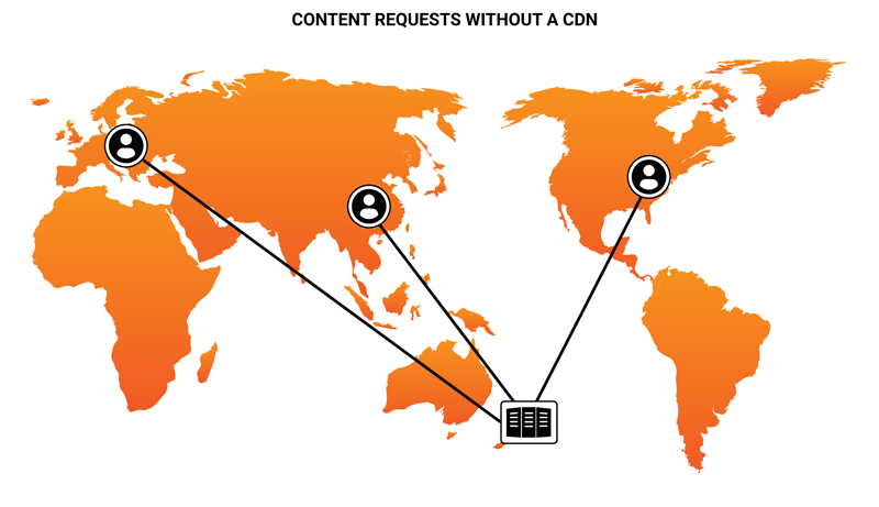 Distributed Delivery: A CDN’s primary function is to store your website's assets around the world and serve those assets to users from points closest to their location. CDNs regularly check your website for updated files, making them available at all times - even when your website is offline in some cases. Rather than a user in New York requesting an image from your website’s server in Auckland, New Zealand (see Fig. 3: Content requests without a CDN) the image will be retrieved from a node (or server) sitting in Dallas (see Figure 4: Content requests with a CDN). This reduces the time it takes for the image to be displayed on the user's device which results in a faster, more responsive user experience.