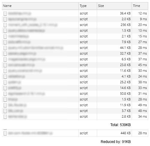 Minimise footprint: To ensure your website is performant, the script file and stylesheet assets should be combined into fewer, larger files. This is called ‘bundling’. These files are then ‘minified’ (unnecessary spaces and formatting are removed) reducing the size of the files web browsers need to download. This also reduces the number of requests the website’s server needs to handle. Figure 1 shows the file size improvement between unbundled and bundled files.