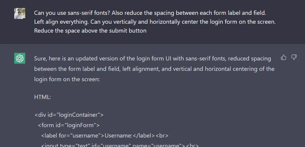 With only a paragraph of directed feedback, ChatGPT has refined the code into something a developer could drop into a project. It’s important to note, though, that this is only the visual part of the login form, meaning a developer would still need to integrate this with the rest of the system as well as perform some form validation and show error messages.