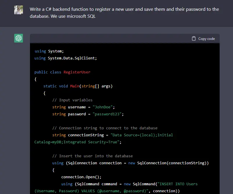 Let’s say we want to register a new user and save them in our database so they can log in again in the future. We simply type in our request, filled with hope that ChatGPT is our new personal servant and that we can spend the rest of our afternoon on the beach: